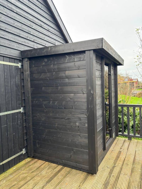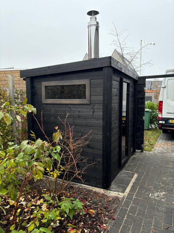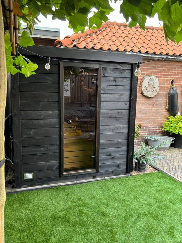 Onze Olufsen buiten sauna’s BLACK SERIE van volledig Nederlands fabrikaat worden vervaardigd uit 42mm massief Fins grenen hout,Behandelt met Tenco Beits en opgebouwd met een dubbele veer- en groefverbinding. Het solide gleufpalen systeem zorgt voor een strakke, robuuste uitstraling.